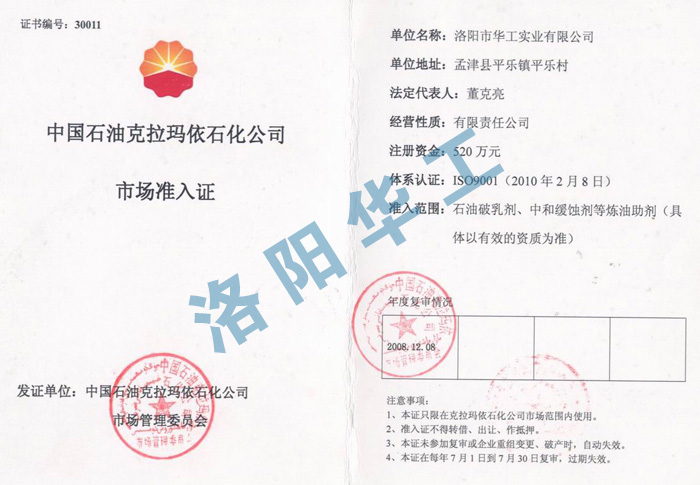 中國石油克拉瑪依石化公司市場(chǎng)準入證
