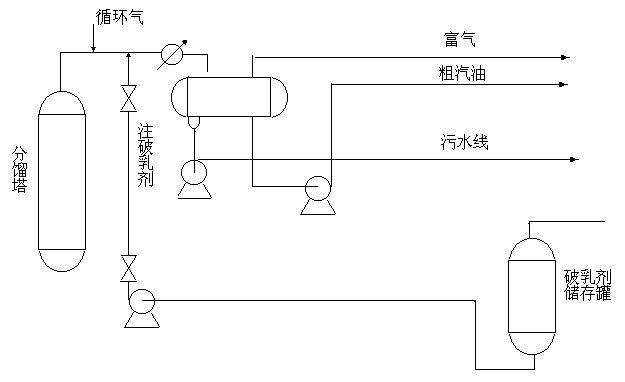 。、破乳劑直接用隔膜泵或往復泵打入塔頂油氣線(xiàn)。